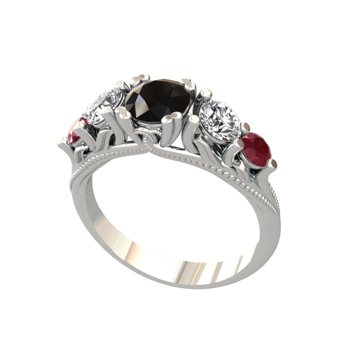 Siyah zirkon, beyaz zirkon ve kök yakut 14 ayar beyaz altın yüzük