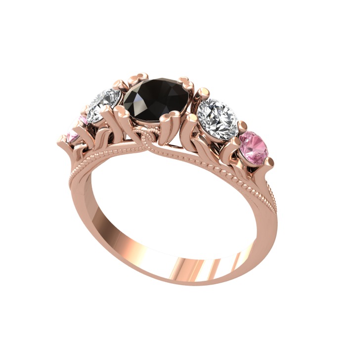 Siyah zirkon, beyaz zirkon ve pembe kuvars 925 ayar rose altın kaplama gümüş yüzük