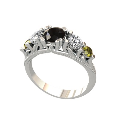 Siyah zirkon, beyaz zirkon ve peridot 8 ayar beyaz altın yüzük
