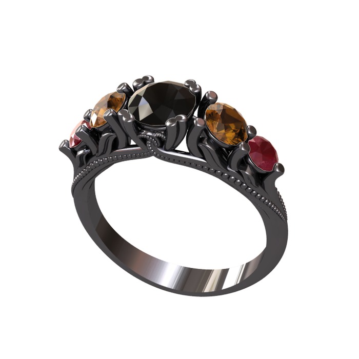 Siyah zirkon, dumanlı kuvars ve kök yakut 925 ayar siyah rodyum kaplama gümüş yüzük