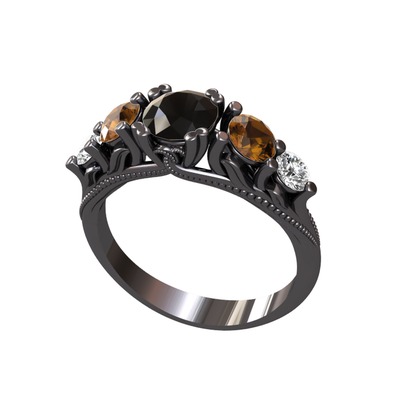 Siyah zirkon, dumanlı kuvars ve pırlanta 925 ayar siyah rodyum kaplama gümüş yüzük (0.36 karat)