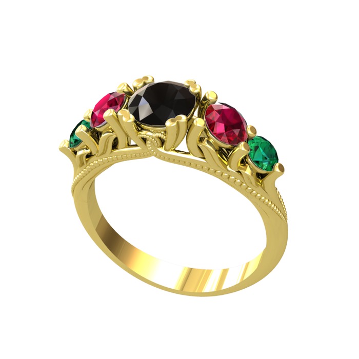 Siyah zirkon, rodolit garnet ve yeşil kuvars 8 ayar altın yüzük