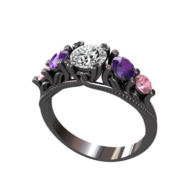 Swarovski, ametist ve pembe kuvars 925 ayar siyah rodyum kaplama gümüş yüzük