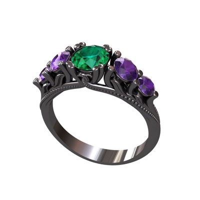 Yeşil kuvars ve ametist 925 ayar siyah rodyum kaplama gümüş yüzük