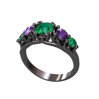 Yeşil kuvars ve ametist 925 ayar siyah rodyum kaplama gümüş yüzük