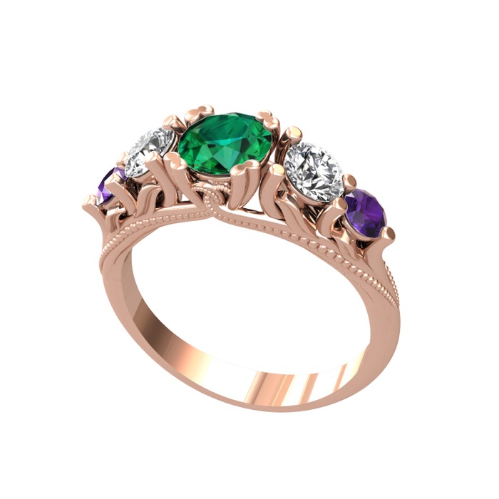 Yeşil kuvars, beyaz zirkon ve ametist 925 ayar rose altın kaplama gümüş yüzük