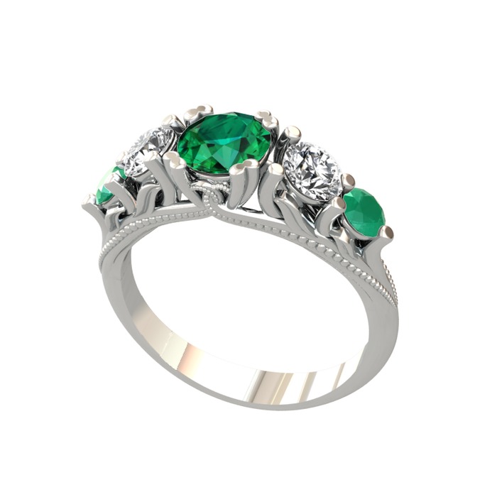Yeşil kuvars, beyaz zirkon ve kök zümrüt 14 ayar beyaz altın yüzük