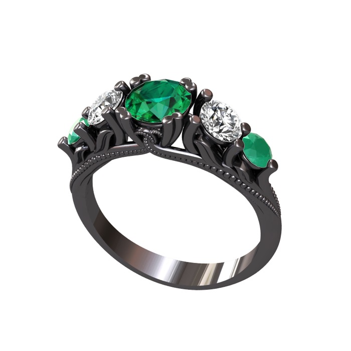 Yeşil kuvars, beyaz zirkon ve kök zümrüt 925 ayar siyah rodyum kaplama gümüş yüzük