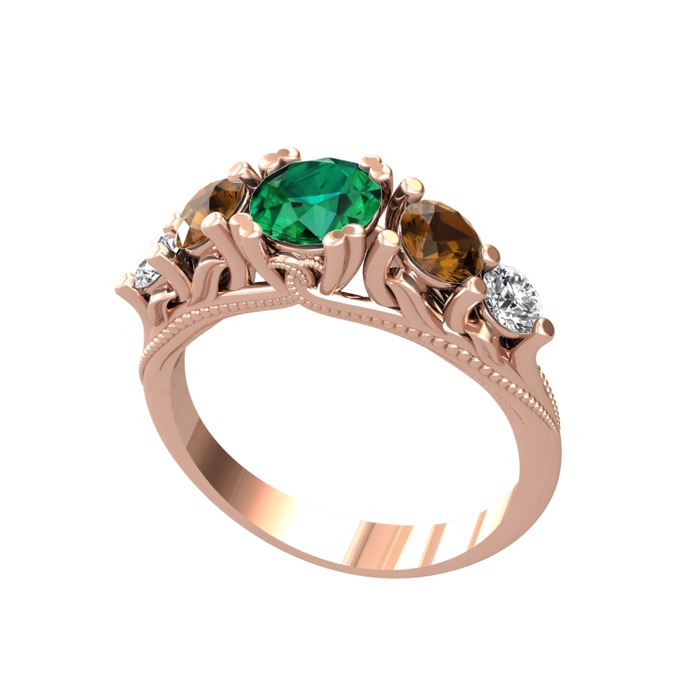 Yeşil kuvars, dumanlı kuvars ve pırlanta 14 ayar rose altın yüzük (0.36 karat)