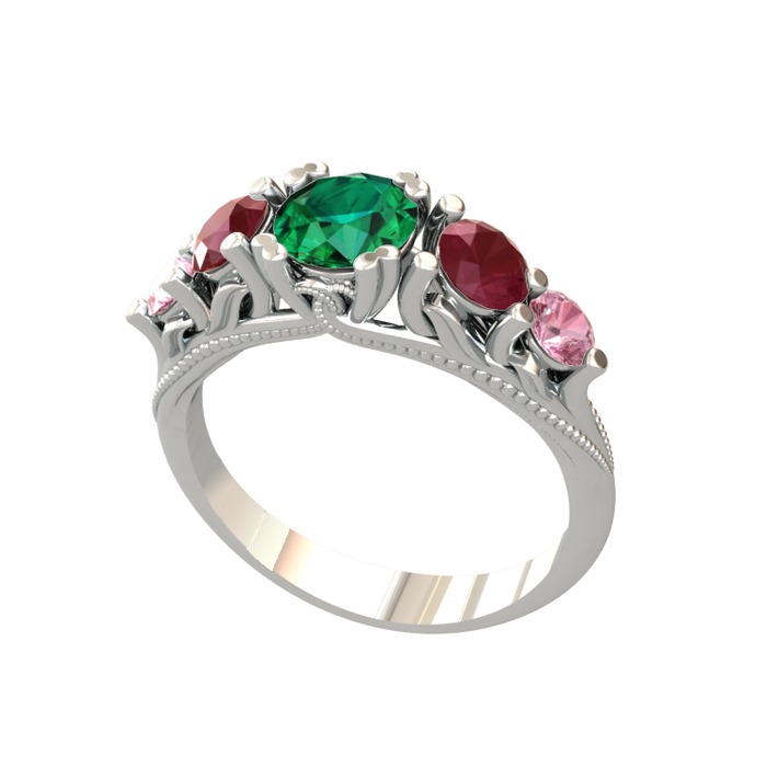 Yeşil kuvars, kök yakut ve pembe kuvars 14 ayar beyaz altın yüzük