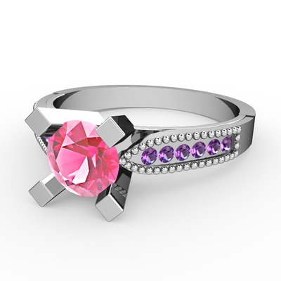 Pembe kuvars ve ametist 8 ayar beyaz altın yüzük