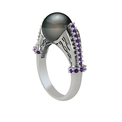Siyah inci ve ametist 14 ayar beyaz altın yüzük