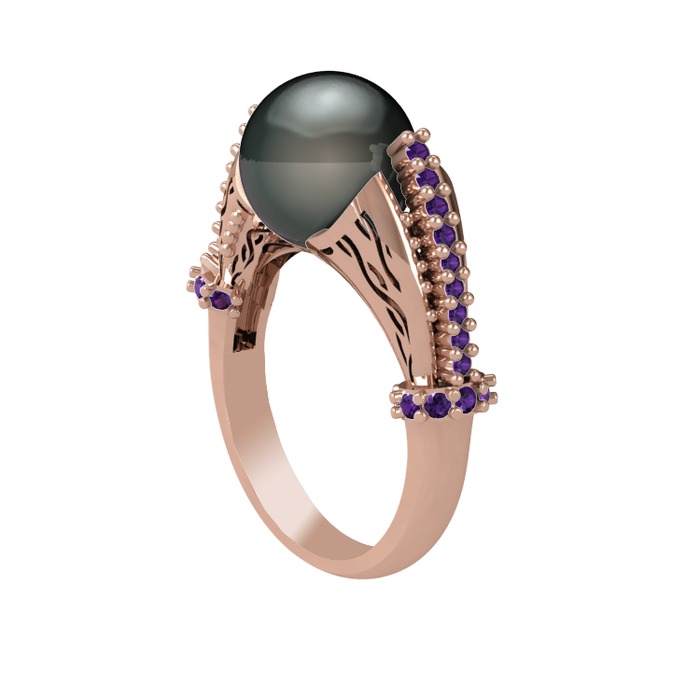 Siyah inci ve ametist 14 ayar rose altın yüzük
