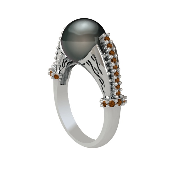 Siyah inci ve dumanlı kuvars 14 ayar beyaz altın yüzük