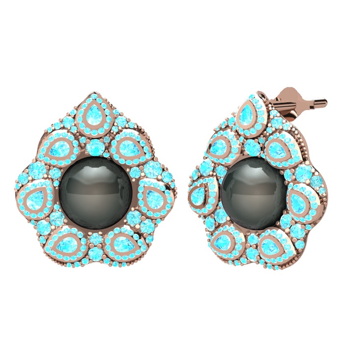 Siyah inci ve akuamarin 8 ayar rose altın küpe