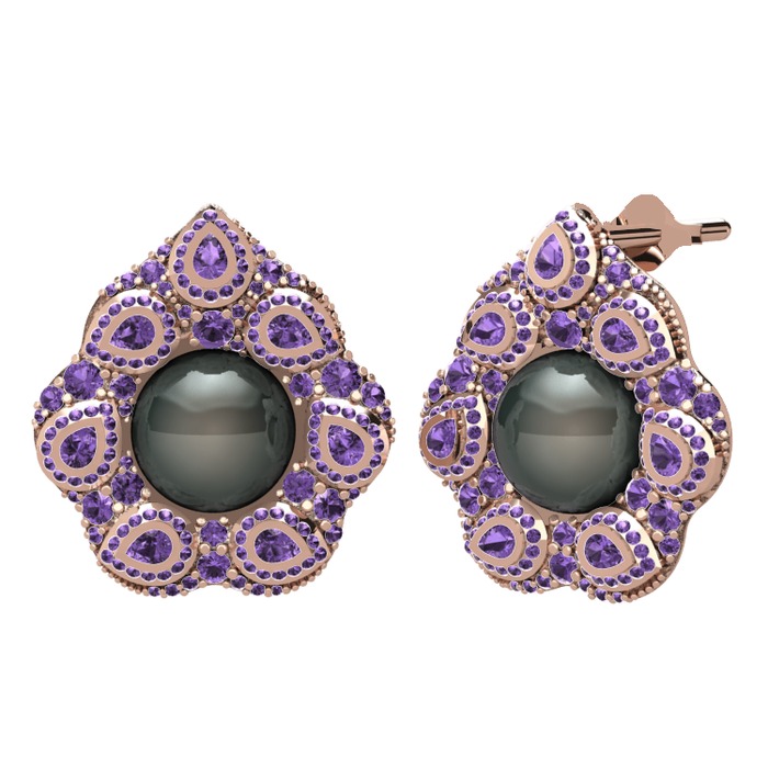 Siyah inci ve ametist 14 ayar rose altın küpe