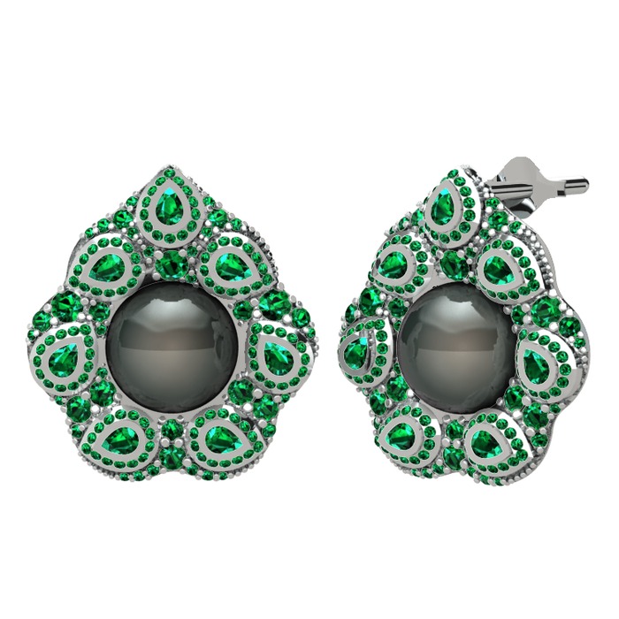 Siyah inci ve yeşil kuvars 8 ayar beyaz altın küpe