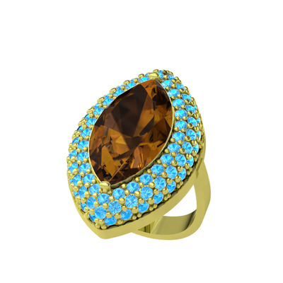 Dumanlı kuvars ve akuamarin 18 ayar altın yüzük