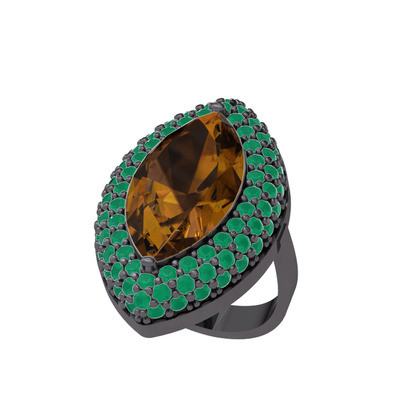 Dumanlı kuvars ve kök zümrüt 925 ayar siyah rodyum kaplama gümüş yüzük