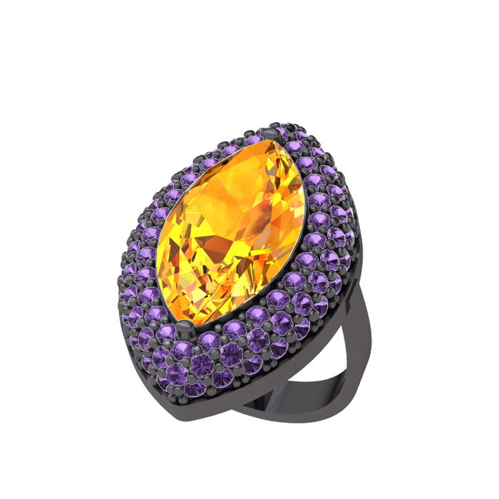 Sitrin ve ametist 925 ayar siyah rodyum kaplama gümüş yüzük