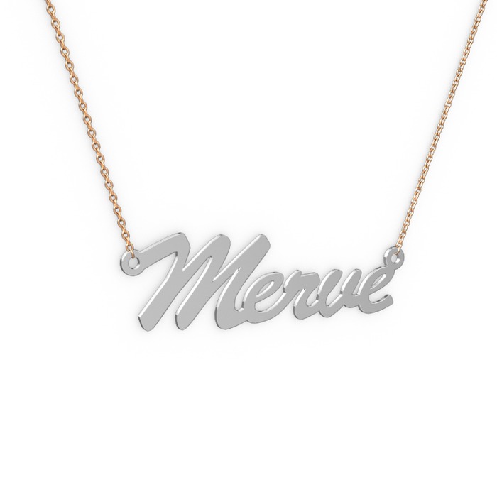 14 ayar beyaz altın kolye (5 karakterli el yazısı, 40 cm rose altın rolo zincir)