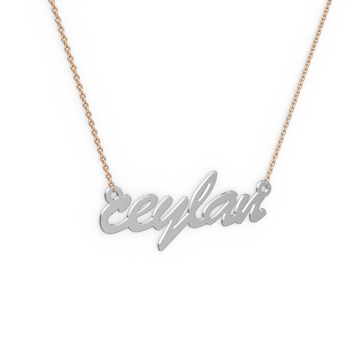 14 ayar beyaz altın kolye (6 karakterli el yazısı, 40 cm rose altın rolo zincir)