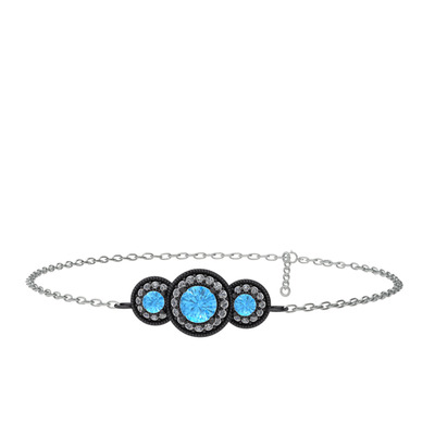 Akuamarin ve beyaz zirkon 925 ayar siyah rodyum kaplama gümüş bilezik (17 cm beyaz altın rolo zincir)