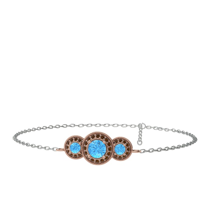 Akuamarin ve dumanlı kuvars 925 ayar rose altın kaplama gümüş bilezik (17 cm beyaz altın rolo zincir)