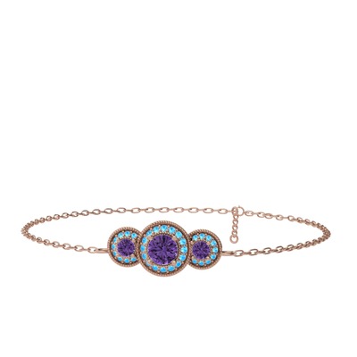 Ametist ve akuamarin 925 ayar rose altın kaplama gümüş bilezik (17 cm rose altın rolo zincir)