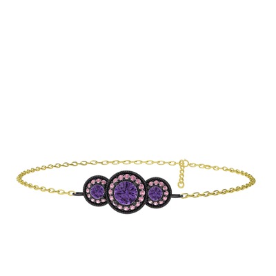 Ametist ve pembe kuvars 925 ayar siyah rodyum kaplama gümüş bilezik (17 cm altın rolo zincir)