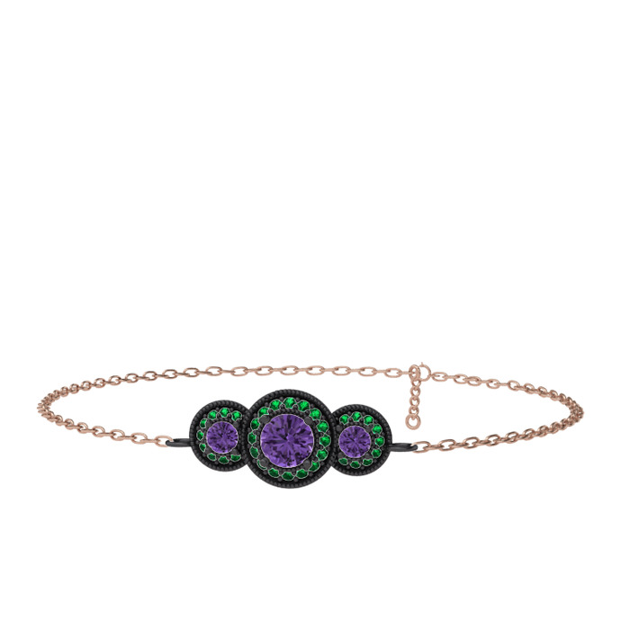 Ametist ve yeşil kuvars 925 ayar siyah rodyum kaplama gümüş bilezik (17 cm gümüş rolo zincir)