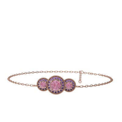 Pembe kuvars ve ametist 14 ayar rose altın bilezik (17 cm gümüş rolo zincir)