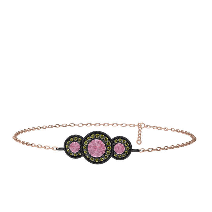 Pembe kuvars ve peridot 925 ayar siyah rodyum kaplama gümüş bilezik (17 cm rose altın rolo zincir)
