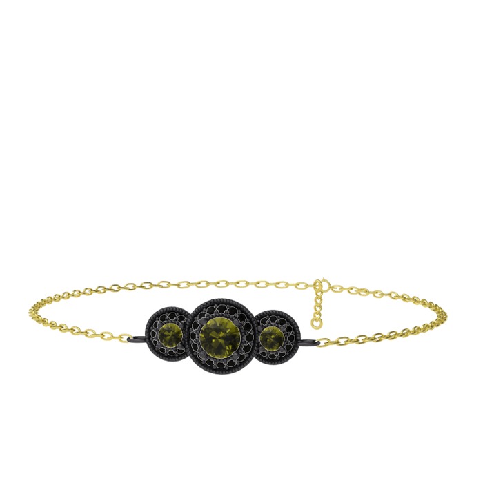 Peridot ve siyah zirkon 925 ayar siyah rodyum kaplama gümüş bilezik (17 cm altın rolo zincir)