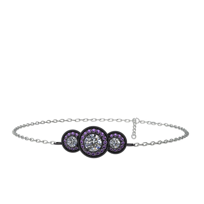 Pırlanta ve ametist 925 ayar siyah rodyum kaplama gümüş bilezik (1.5 karat, 17 cm beyaz altın rolo zincir)