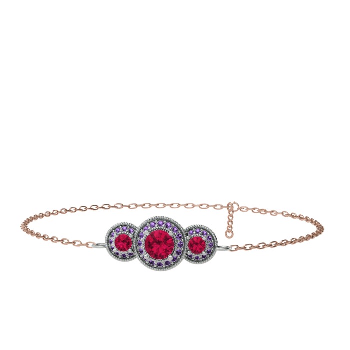 Rodolit garnet ve ametist 925 ayar gümüş bilezik (17 cm rose altın rolo zincir)
