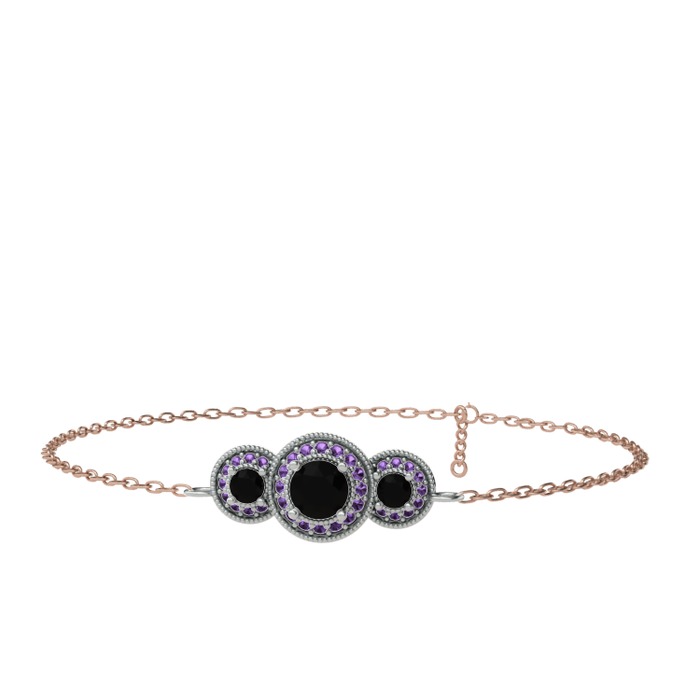 Siyah zirkon ve ametist 8 ayar beyaz altın bilezik (17 cm rose altın rolo zincir)