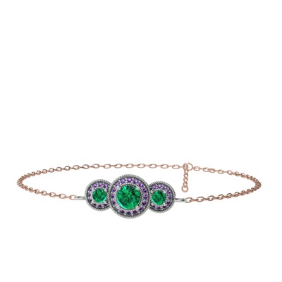 Yeşil kuvars ve ametist 14 ayar beyaz altın bilezik (17 cm gümüş rolo zincir)