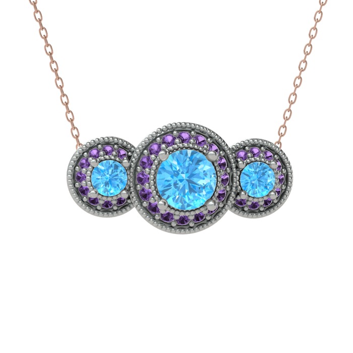 Akuamarin ve ametist 14 ayar beyaz altın kolye (40 cm rose altın rolo zincir)