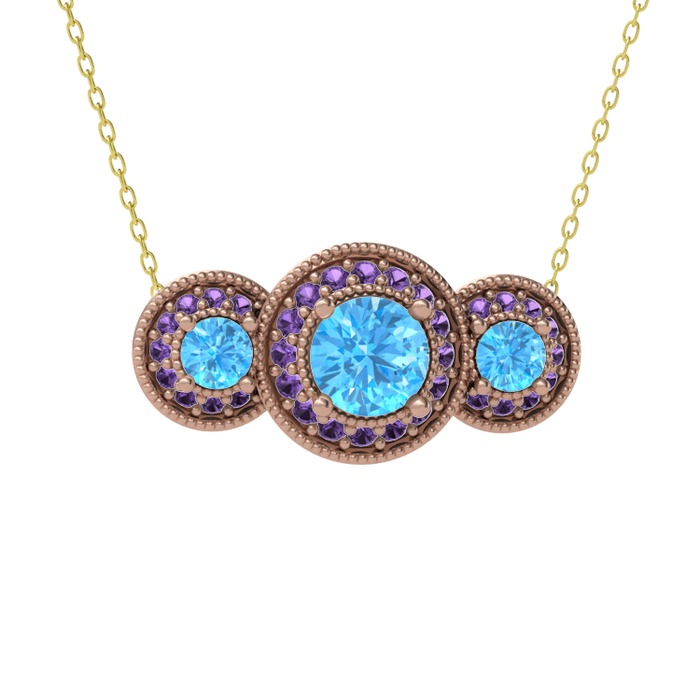 Akuamarin ve ametist 18 ayar rose altın kolye (40 cm altın rolo zincir)