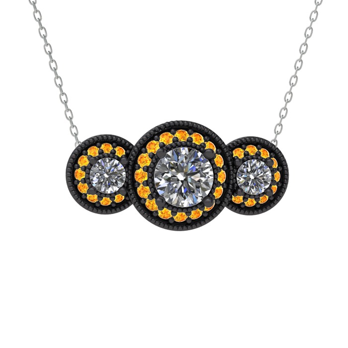 Beyaz zirkon ve sitrin 925 ayar siyah rodyum kaplama gümüş kolye (40 cm beyaz altın rolo zincir)