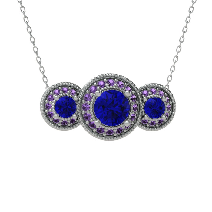 Lab safir ve ametist 18 ayar beyaz altın kolye (40 cm gümüş rolo zincir)