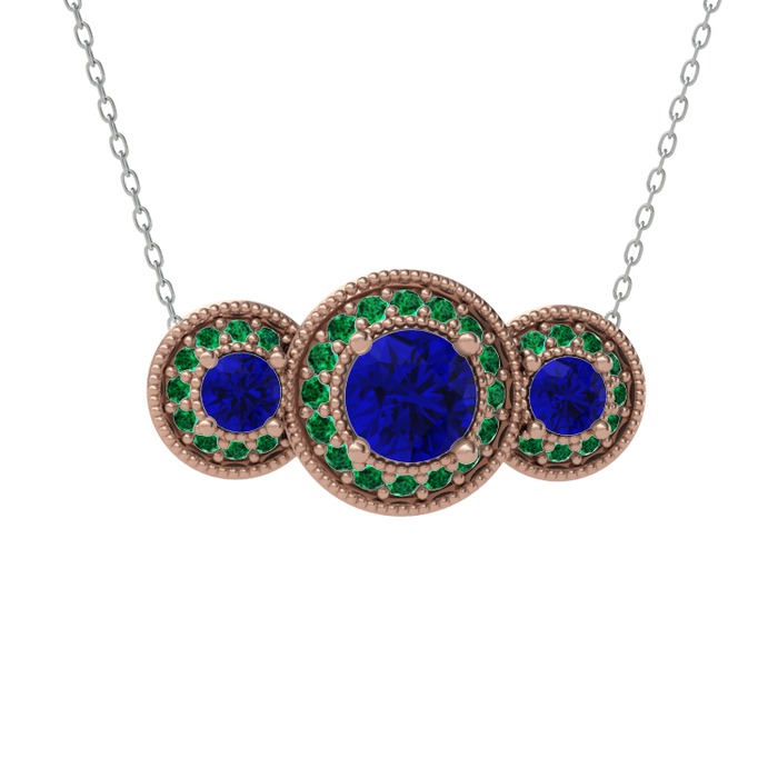 Lab safir ve yeşil kuvars 14 ayar rose altın kolye (40 cm gümüş rolo zincir)