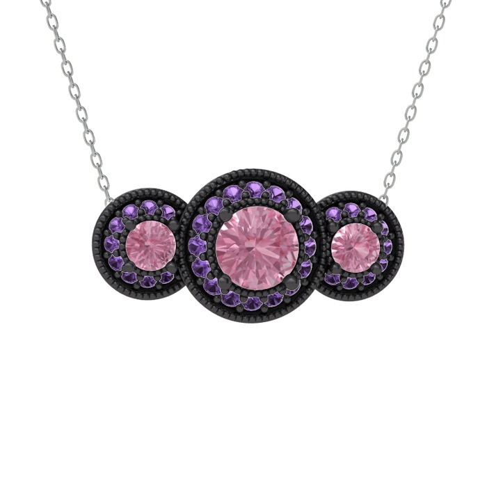 Pembe kuvars ve ametist 925 ayar siyah rodyum kaplama gümüş kolye (40 cm gümüş rolo zincir)