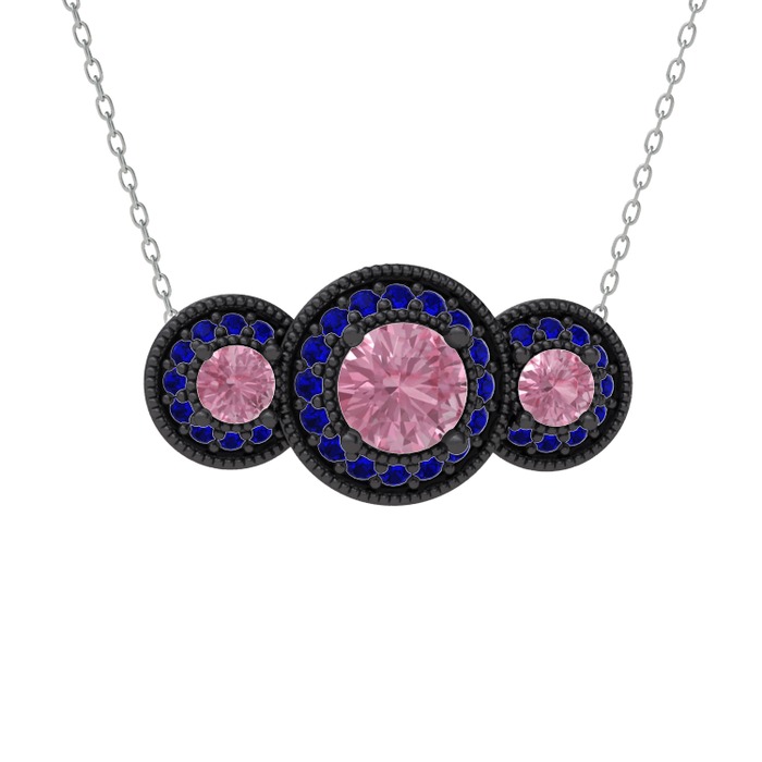 Pembe kuvars ve lab safir 925 ayar siyah rodyum kaplama gümüş kolye (40 cm gümüş rolo zincir)