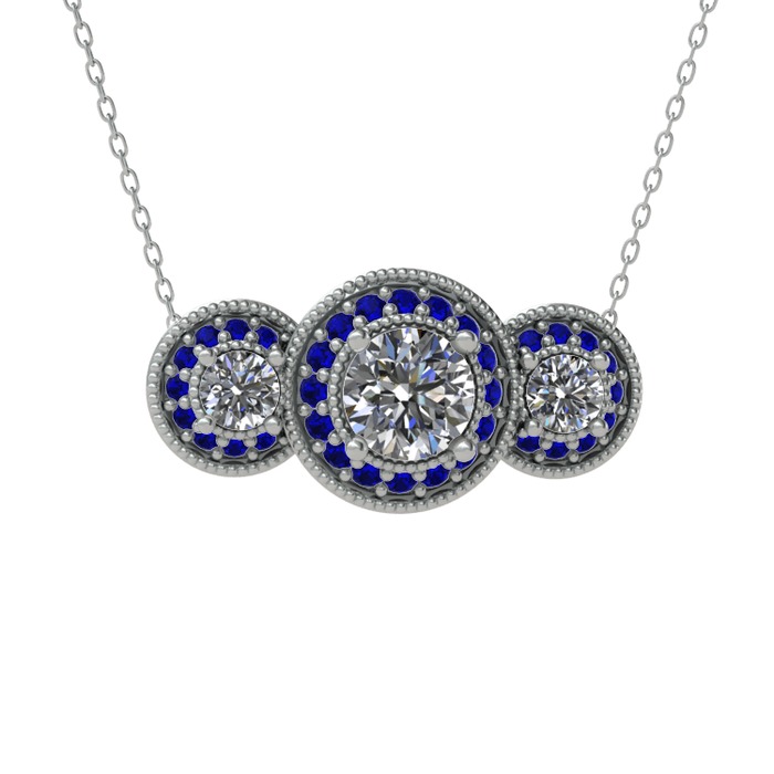 Pırlanta ve lab safir 925 ayar gümüş kolye (1.5 karat, 40 cm beyaz altın rolo zincir)