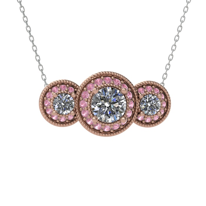 Pırlanta ve pembe kuvars 8 ayar rose altın kolye (1.5 karat, 40 cm beyaz altın rolo zincir)