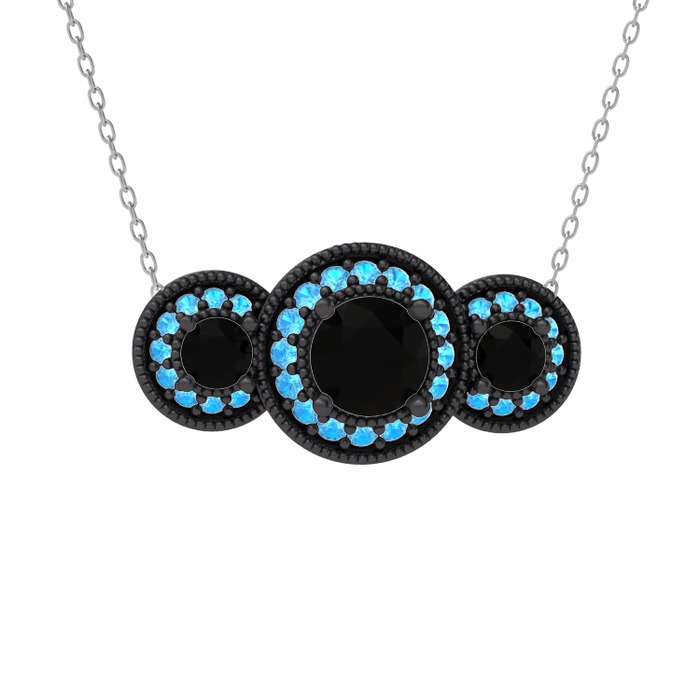 Siyah zirkon ve akuamarin 925 ayar siyah rodyum kaplama gümüş kolye (40 cm beyaz altın rolo zincir)