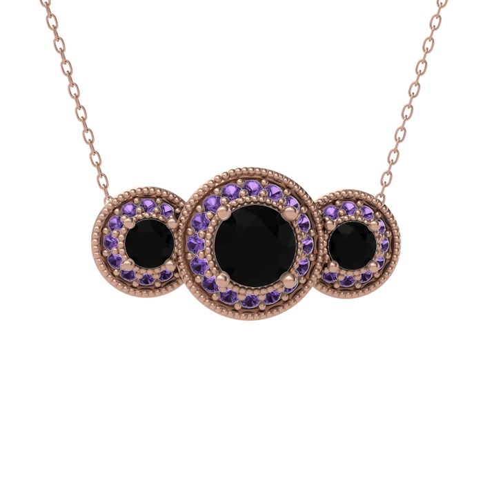 Siyah zirkon ve ametist 925 ayar rose altın kaplama gümüş kolye (40 cm rose altın rolo zincir)