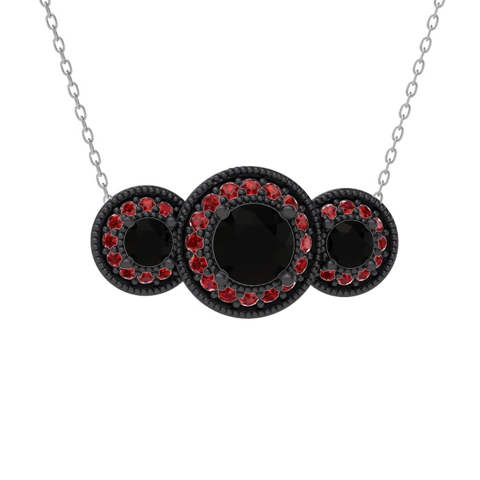 Siyah zirkon ve garnet 925 ayar siyah rodyum kaplama gümüş kolye (40 cm beyaz altın rolo zincir)